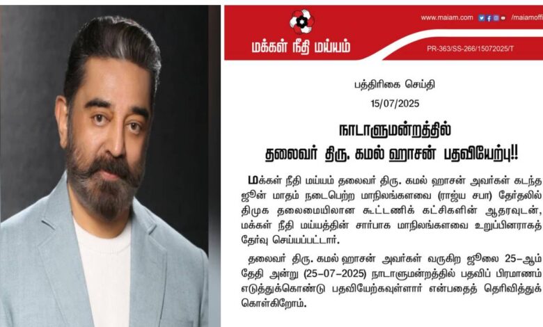 கமல்ஹாசன், எதிர்வரும் 25 ஆம் திகதி அன்று நாடாளுமன்றத்தில் பதவிப் பிரமாணம் எடுத்துக்கொண்டு பதவியேற்கவுள்ளார் என்பதைத் தெரிவித்துக் கொள்கிறோம்” என கூறப்பட்டுள்ளது.