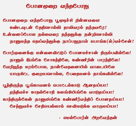 கவிதைகள்“போனமுறை வந்தபோது”… கவிதை… மெல்போர்ன் அறவேந்தன்August 23, 20250 August 23, 20250 Facebook Twitter LinkedIn Messenger Messenger WhatsApp Viber