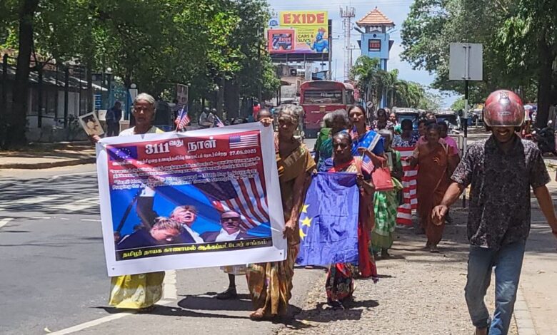 வவுனியா பிரதான தபாலகத்திற்கு அருகாமையில் தொடர் போராட்டம் மேற்கொண்டு வரும் அவர்கள் 3111 வது நாளான இன்று குறித்த ஊர்வலத்தினை ஏற்பாடு செய்திர்ந்தனர்.