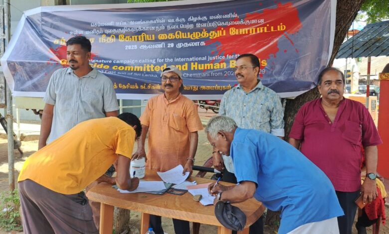 செம்மணி உட்பட இலங்கையின் வடக்கு, கிழக்கு மண்ணில் இனங்காணப்பட்ட மனிதப் புதைகுழிகள் மற்றும் நடைபெற்ற தமிழ் இனப்படுகொலைகளுக்கும் நீதியைக் கோருவதற்காக தமிழ்த் தேசியக் கட்சிகள் மற்றும் பொது அமைப்புகளின் ஏற்பாட்டில் கையெழுத்துச் சேகரிக்கும் செயற்பாடு வடக்கு, கிழக்கு மாகாணங்களில் தற்போது முன்னெடுக்கப்பட்டு வருகின்றது.
