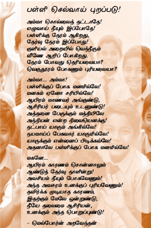கவிதைகள்“பள்ளி செல்வாய் புறப்படு!”… கவிதை… மெல்போர்ன் அறவேந்தன்September 1, 20250 September 1, 20250 Facebook Twitter LinkedIn Messenger Messenger WhatsApp Viber