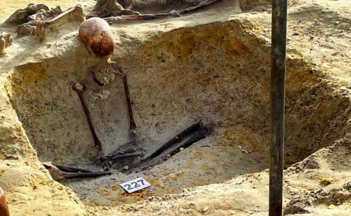 இதன்போது, அவற்றுள் 227 என்று இலக்கமிடப்பட்ட என்புக் கூட்டுத் தொகுதி கால்கள் மடிக்கப்பட்டு அமர்ந்த நிலை யில் மீட்கப்பட்டது.