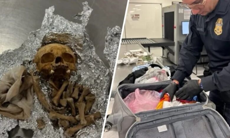 ஒரு பயணியின் பொருட்களுக்குள் அலுமினியத் தாளில் சுற்றப்பட்டிருந்த நிலையில் மண்டை ஓடு மற்றும் எலும்புகளின் ஒரு பகுதி உட்பட எச்சங்கள் கண்டுபிடிக்கப்பட்டுள்ளது.