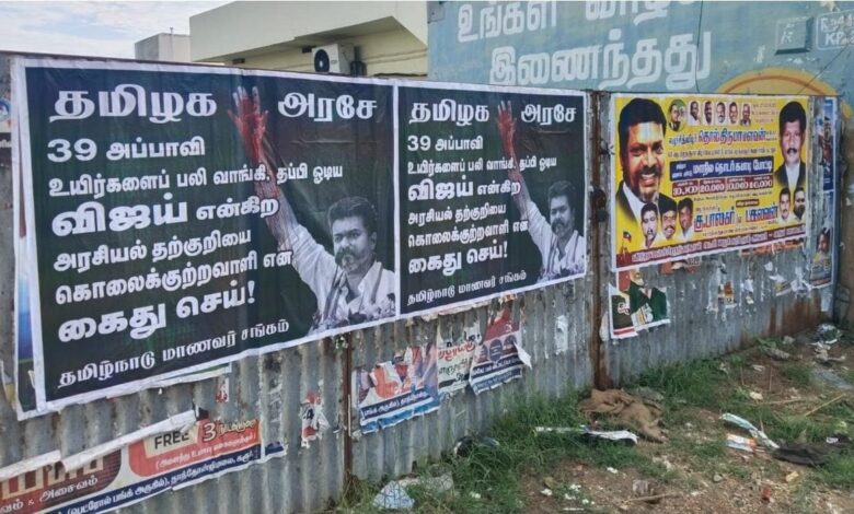 விஜய்யை கைது செய்ய வலியுறுத்தி கரூர் முழுவதும் ஒட்டப்பட்ட சுவரொட்டிகள்