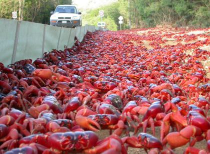 அவைதான் ஆஸ்திரேலியாவின் கிறிஸ்மஸ் தீவு செந்நிற நண்டுகள். 43.7 மில்லியன் நண்டுகள் இத்தீவு வாசிகள்! ஆஸ்திரேலியாவின் சனத்தொகையை விட (25.9 மி) ஏறத்தாள இரண்டு மடங்கு என்று வைத்துக்கொள்ளுங்களேன்!