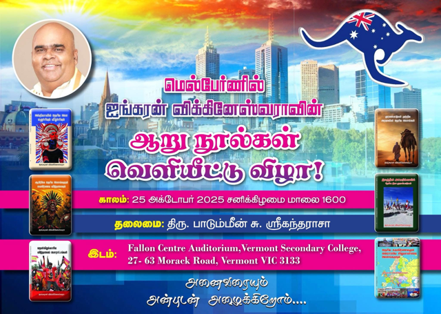 மெல்பேர்ண் மாநகரில் ஐங்கரன் விக்கினேஸ்வராவின் ஆறு நூல்கள் வெளியிடப்பட உள்ளது.