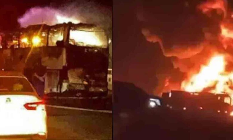 டீசல் டேங்கர் லொறி மீது பேருந்து மோதியதால் பெரும் தீ விபத்து ஏற்பட்டுள்ளது. விபத்து நடந்தபோது பெரும்பாலான பயணிகள் உறங்கிக் கொண்டிருந்ததால் அவர்களால் தப்பிப்பது கடினமாகியுள்ளது.