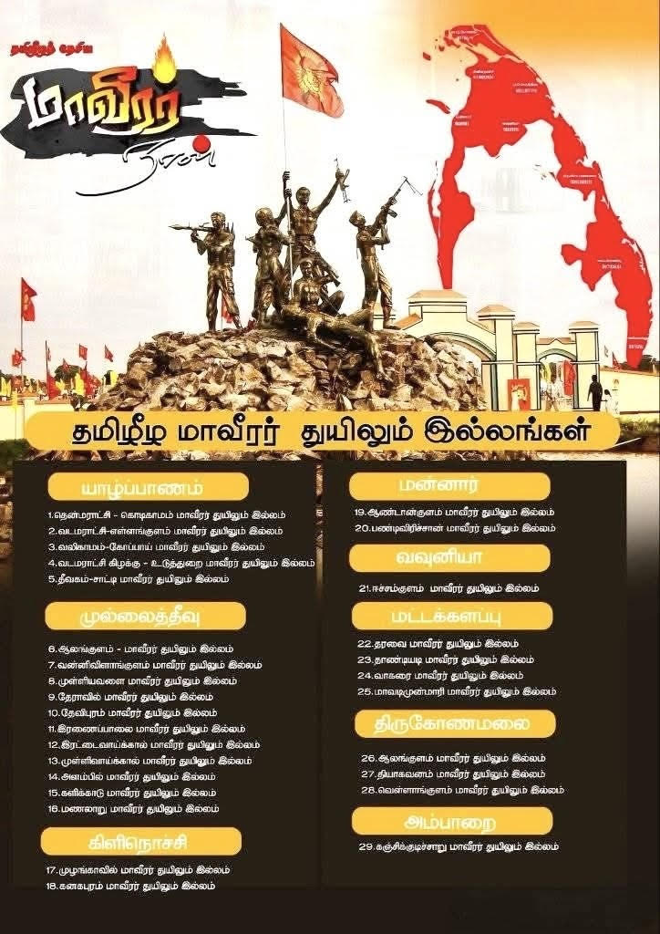 அத்துடன் துயிலும் இல்லங்களில் இராணுவ முகாங்களையும் தமக்கான விளையாட்டு மைதானங்களையும் அமைத்தது இலங்கை இராணுவம். தற்போது கார்த்திகை மாதத்தில் மாவீரர் தினம் அனுஷ்டிக்கப்படுகின்றது. வடக்கு, கிழக்கில் 32 இற்கு மேற்பட்ட மாவீரர் துயிலும் இல்லங்கள் உள்ளன. தமிழ் இனத்துக்காக, விடுதலைக்காக போராடிய மாவீரர்கள். பொதுமக்கள் விதைக்கப்பட்டுள்ள அந்த புனிதமான – கண்ணியமான இடங்களை அழித்த வரலாற்று தவறை செய்து, சிங்கள அரசு தன் உண்மை முகத்தை காட்டியுள்ளது.