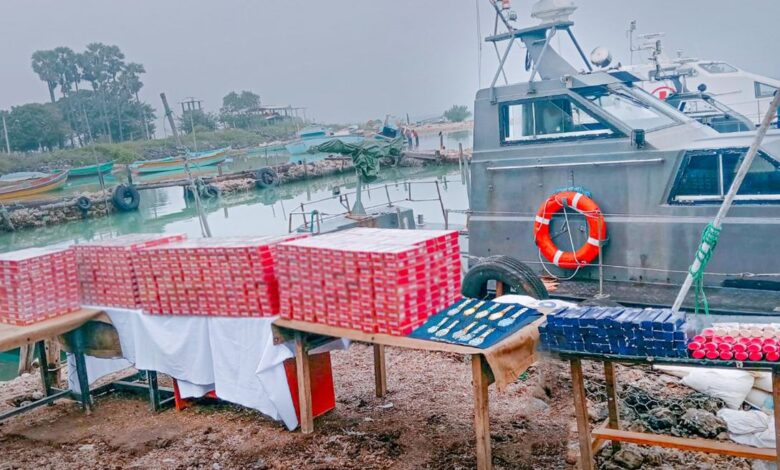 நெடுந்தீவு தெற்கு கடற்பகுதியில் இருந்து பெருந்தொகையான வெளிநாட்டு சிகரெட்டுகள், அழகுசாதனப் பொருட்கள் மற்றும் கைக்கடிகாரங்கள் ஆகியவற்றை கடற்படையினர் கைப்பற்றியுள்ளனர்.