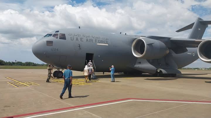 ஐக்கிய அரபு எமிரேட்ஸ் விமானப்படையின் மிகப்பெரிய சரக்கு விமானமான C-17 விமானத்தில் இந்தப் பொருள் பண்டாரநாயக்க சர்வதேச விமான நிலையத்தை வந்தடைந்தது.