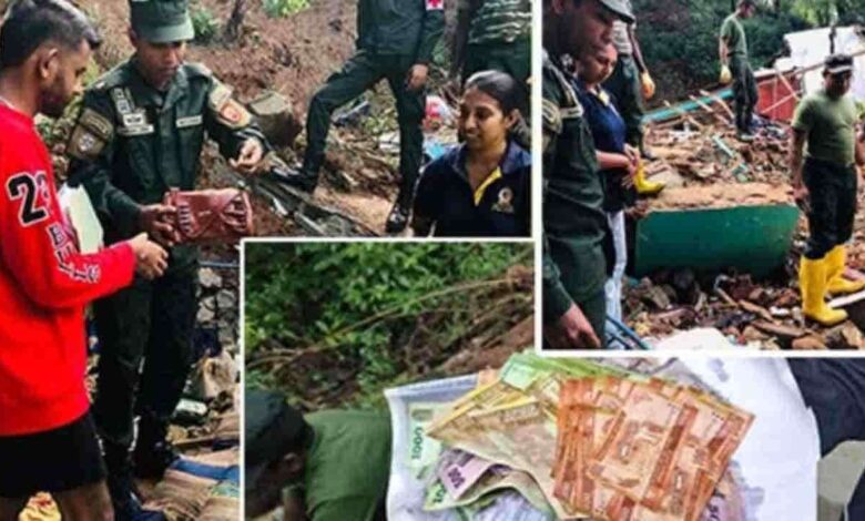 மண்சரிவு காரணமாக முழுமையாக அழிந்துபோன ஒரு வீட்டின் இடிபாடுகளுக்குள் இருந்தே இந்த பொருட்களும் பணமும் கண்டுபிடிக்கப்பட்டன.