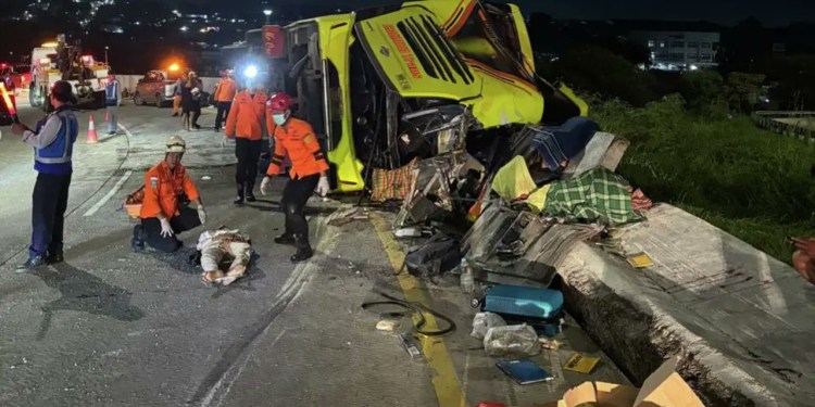 34 பேருடன் பயணித்த குறித்த பேருந்து ஒரு சுங்கச்சாவடியில் வேகக்கட்டுப்பாட்டை இழந்து ஒரு கொன்கிறீட் தடுப்பு சுவருடன் மோதி, பின்னர் கவிழ்ந்து விபத்துக்குள்ளானதாக தேடல் மற்றும் மீட்புக் குழுவின் தலைவர் புடியோனோ கூறியுள்ளார்.
