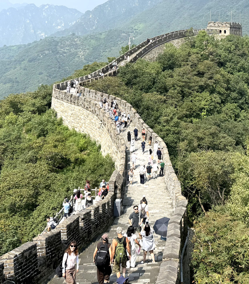 அது என்னவோ தெரியாது. ஆனால் இங்கு விரும்பி ஏறியதால் அதற்குண்டான பலன் கிடைத்தது. ஒவ்வொரு படியும் அவ்வளவு உயரம். வீம்பு பண்ணி ஏறியவர்கள் எல்லோரும் வேதனைப்பட்டார்கள். ஒரு வழியாக ஏறி முடித்தோம். உழைப்பின் பயன் அப்போது தெரிந்தது. கண்முன் சீனப் பெருஞ்சுவர் முடிவின்றி நீண்டு சென்றது. சுவரின்இருபுறமும் காடுகள் போல் மரங்கள் செழித்து வளர்ந்திருந்தன.