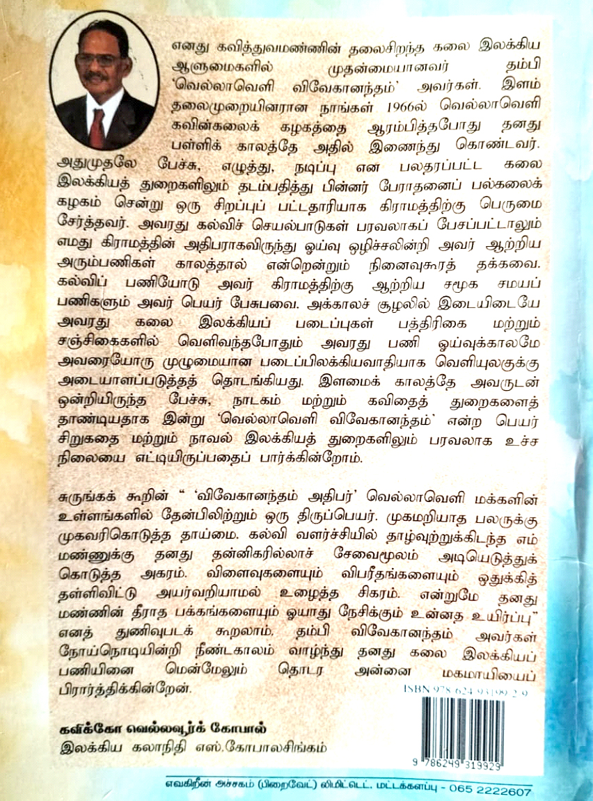 மட்டக்களப்பின் வெல்லாவெளிக் கிராமத்தைப் பிறப்பிடமாகக் கொண்ட த.விவேகானந்தம் பேராதளைப் பல்கலைக்கழகத்தில் கற்ற புவியியல் சிறப்புப் பட்டதாரி. இவர் ஆசிரியர் அற்றும் அதிபர் சேவையில் 30 வருட காலம் பணியாற்றி ஓய்வு பெற்றவர். ஆரம்பத்தில் கவிதை எழுதுவதிலும் நாடகத் தயாரிப்பு, நடிப்பு, கவி அரங்குகளில் கவிதை எழுதி வாசிப்பதிலும் விமர்சனத் துறையிலும் கட்டுரை எழுதுவதிலும் ஈடுபாடு கொண்டிருந்தார் பதுளையில் ஆசிரியராகப் பணியாற்றிய காலத்தில் ‘அரும்பு’ (1987) எனும் சஞ்சிகை தோன்றி வளரக் காரணமாக இருந்தார். அதேபோல் மட்/பட்/வெல்லாவெளி கலைமகள் மகா வித்தியாலயத்தில் அதிபராகப் பணியாற்றிய காலத்தில் ‘விழுது’ வருடாந்த சஞசிகையை 2007 இல் ஆரம்பித்து பதவி ஓய்வு பெறுமவரை நடாத்தி வந்தார். 2011 இல் கல்வி அமைச்சினால் சிறந்த அதிபருக்கான ‘குரு பிரதீபா பிரபா’ விருது வழங்கிக் கௌரவிக்கப்பட்டார். அரச பணி ஓய்வின் பின்னர் சிறுகதை, நாவல் எழுதுவதில் கவனம் செலுத்தி உமிச்சட்டி (2024) சிறுகதைத் தொகுப்பு, ஒற்றைப் பனை (2025) சிறுகதைத் தொகுப்பு, மகாவலி கங்கைக் கரையினிலே… (2025) நாவல் ஆகியவற்றை வெளியிட்டிருக்கின்றார். உமிச்சட்டி சிறுகதைத் தொகுப்புக்கு 2025 இல் கிழக்கு மாகாண சாகித்திய விருது வழங்கிக் கௌரவிக்கப்பட்டார்