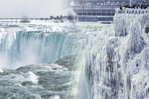 கடந்த சில நாட்களுக்கு முன்பு, வட துருவ சுழற்சியின் தாக்கத்தால் வெப்பநிலை -20°C வரை குறைந்தது. இதனால் நயாகரா நீர்வீழ்ச்சியில் இருந்து எழும் குளிர்ந்த சாரல் மற்றும் பனிமூட்டங்கள் உறைந்து, பனிக்கட்டியாக மாறியுள்ளன.