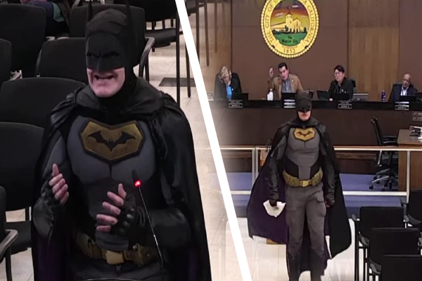கலிபோர்னியா நகர சபைக்கு ‘பேட்மேன்’ உடை அணிந்து வந்து புகார் கூறிய நபர்