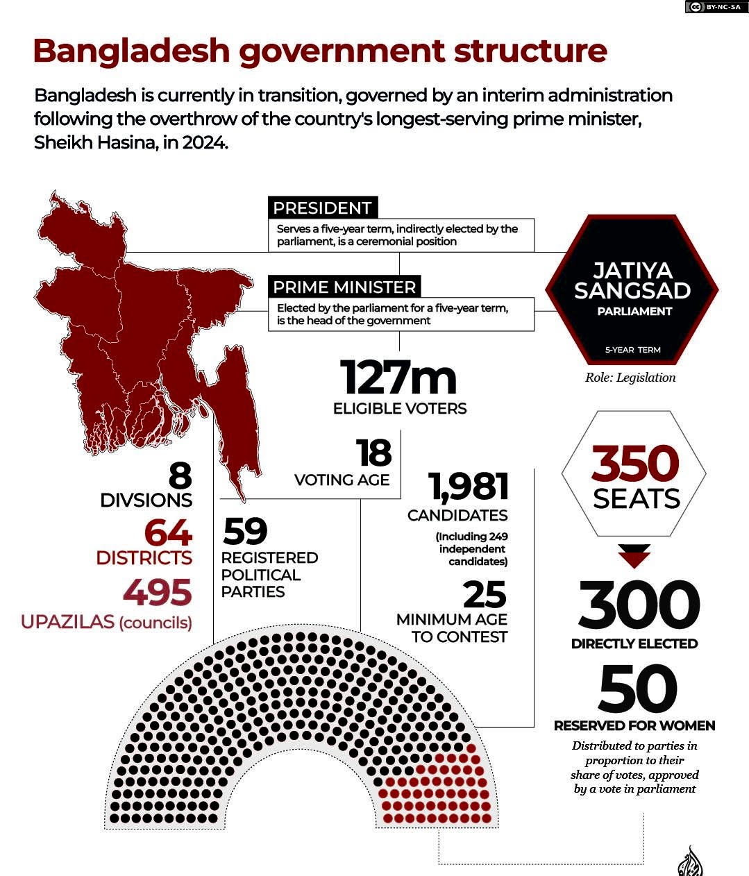 ஷேக் ஹசீனாவின் ஆட்சி வீழ்த்தப்பட்ட பிறகு, இடைக்கால தலைவர் முஹம்மது யூனுஸ் தலைமையில் நடைபெறும் இந்த தேர்தலில், தாரிக் ரஹ்மான் தலைமையிலான பிஎன்பி (BNP) மற்றும் ஜமாஅத்-இ-இஸ்லாமி (Jamaat-e-Islami) ஆகிய கட்சிகளிடையே கடும் போட்டி நிலவுகிறது.