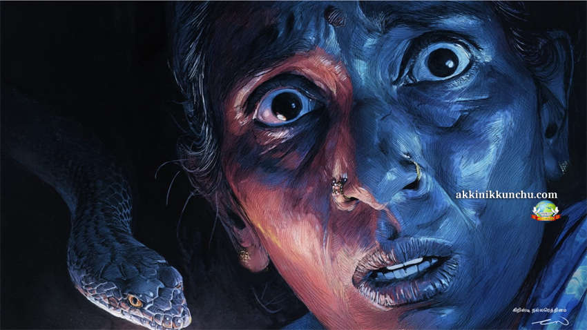 வெடித்து வந்த அழுகையோடு தனது கைகளில் ஒட்டியிருந்த ஜெகதீஸ்வரலிங்கத்தின் ரத்தத் தெறிப்புகளைப் பார்த்தான். பாப்பாத்தியின் தலையைத் தூக்கி தனது மடியில் வைத்துக்கொண்டு அவன் தேம்பிக்கொண்டே அம்மாவிற்குத் திடீரென என்ன நடந்தது என யோசித்த நொடியில், அவனுக்கும் தெரியாமல் அவளின் தலையணையின் அடியிலிருந்து மெல்ல மெல்ல ஊர்ந்து சென்று சுவற்றிலுள்ள வலைக்குள் புகுந்து கொண்டது ஒரு நாகம்.