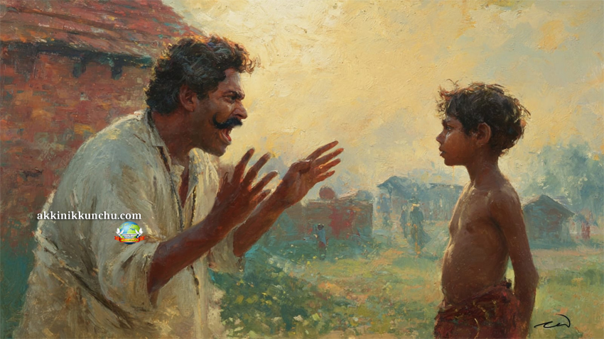 “எலே சொடலை… பக்கத்து வீட்டு பரமசிவம் கொல்லையில காளை மாடுக ரெண்டும் உள்ளே நொழஞ்சிடுச்சாமில்ல.?. காலங்காத்தாலே வந்து காட்டுக் கத்தா சுத்திட்டுப் போறான்.. நிய்யி என்னடா மயிறு வேல பாக்குற? மாட்டைக் கொண்டு விட்டுட்டு சுத்தப் போய்டுறியாமே…? ஆளு வந்து சொல்லிச்சி… ஒழுங்கா வேலையப் பாரு. இல்லன்னா தோலை உரிச்சி உப்பு போட்டுருவேன்…. படவா!”