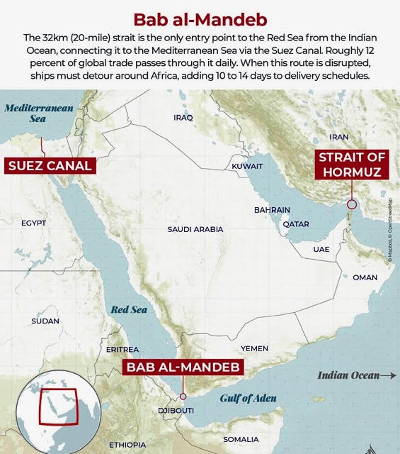 (உலக பொருளாதாரத்தினை மேலும் சீர்குலைக்கும் வகையில் முக்கிய கடல் வழிப்பாதையான சூயஸ் கால்வாய் செல்லும் செங்கடல் பகுதியில் ஏமனின் ஹவுதிக்களின் தாக்குதல்கள் அதிகரித்துள்ளன. ஏற்கனவே இப்போரால் ஹார்முஸ் நீரிணையை ஈரான் மூடியிருப்பதால் உலக அளவில் கச்சாய் எண்ணெய் விலை உயர்ந்து கடும் தட்டுப்பாடு ஏற்பட்டுள்ளது)