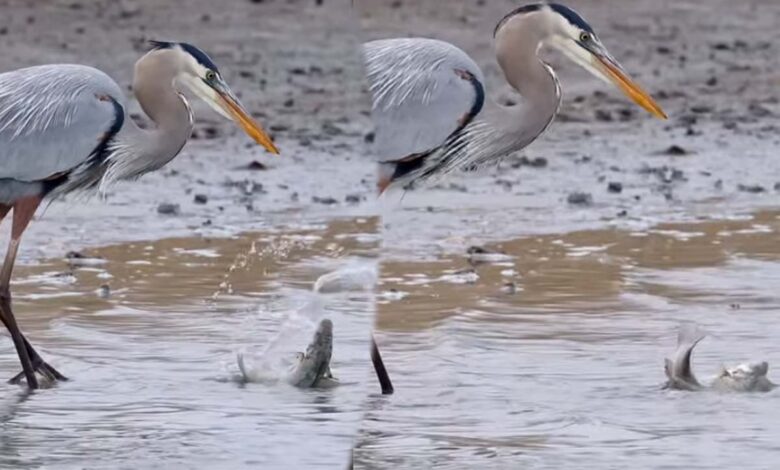 பொதுவாக பசி என்று வந்துவிட்டால் ஒரு உயிரினம், மற்றொரு உயிரினத்தை வேட்டையாடி சாப்பிட்டே ஆக வேண்டும். அந்த வகையில் இங்கு Heron வகையைச் சேர்ந்த நீல நிற நாரை ஒன்று மீனை வேட்டையாடியுள்ளது.