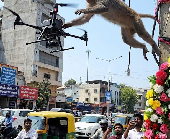 சமூக வலைத்தளங்களில் தற்போது வைரலாகி வரும் ஒரு காணொளியில், மின் கம்பத்தில் அமர்ந்திருந்த குரங்கு ஒன்று, காற்றில் பறந்து கொண்டிருந்த ட்ரோன் (Drone) கருவியின் மீது பாய்ந்து அதைப் பிடித்தவாறே காற்றில் பறக்கும் அதிர்ச்சியூட்டும் காட்சி பதிவாகியுள்ளது.