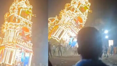 திடீரென சரிந்து விழுந்த 60 அடி உயர தேர் ; சூழ்ந்திருந்த பக்தர்களுக்கு நடந்த சம்பவம்
