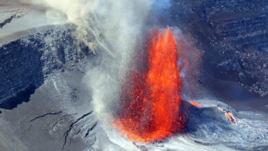 625 அடி உயரத்திற்கு பீறிட்டு நெருப்பு குழம்பை கக்கும் கிலாவியா எரிமலை