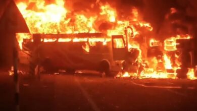 முழுவதுமாக தீப்பிடித்து எரிந்த பேருந்து; 14 பேர் உடல் கருகி பலி
